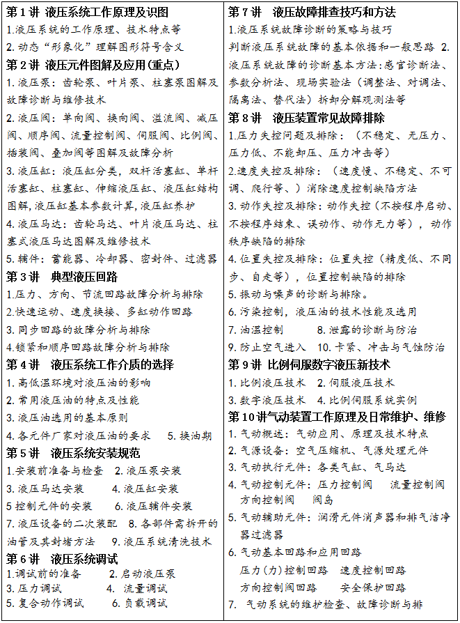 本课程为短期精品课程,小班授课,保证教学质量,力争在短期内提高学员的技能水平。本课程授课大纲和讲义是我们在长期培训过程中不断改进完善而成的,实用易懂。主讲老师是从生产一线走出的资深高工,长期从事液压气动装备的 安装、调试、维护、故障诊断排除、改造升级等工作,授课案例丰富,极具参考价值。