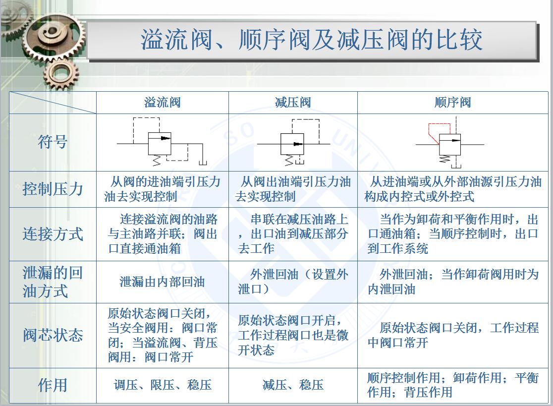 在我们开展液压培训的过程当中,我们发现很多初学者对溢流阀、顺序阀及减压阀的认识比较模糊,因此我们上传了一张表格,直观地对吧三者的区别。 表格来源:胡军科版液压培训讲义