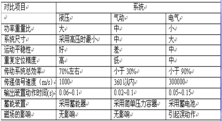 | 液压、气动、电气系统的横向对比 | ||