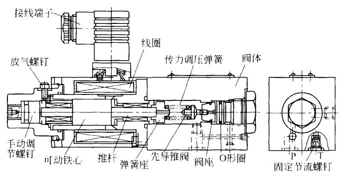 下图为为日本油研公司EDG型直动式比例溢流阀的结构图。工作前应先松开左端放气螺钉放气,以保证工作过程中不至于因空气而产生的噪声和振动。比例电磁铁不通电时,依然可用左端的手动调节螺钉来调节工作压力。