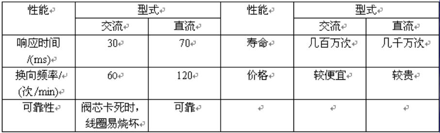 三、换向阀的选择 a)按通过阀的流量来选择结构型式,一般来说,流量在190L/min以上时宜用二通插装阀;190L/min以下时可采用滑阀型换向闽。70L/min以下时可用电磁换向阀(一般为6、10mm通径),否则需要选用电液换向阀。 b)按换向性能等来选择电磁铁类型,交、直流电磁铁的性能比较见下表。