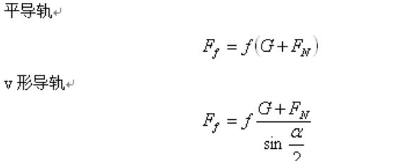 式中:— 摩擦系数,其中,静摩擦系数和动摩擦系数值参考表2.1; — 运动部件的重力; —垂直于导轨的工作负载; — V形导轨面的夹角,一般=90°。